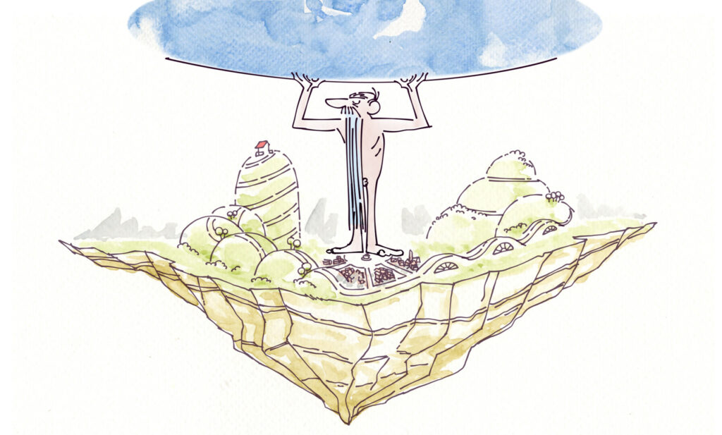 Atlante è gravato di una responsabilità enorme: sostenere la volta celeste. Mentre lui è immobile, ai suoi piedi tutto un mondo brulica, indifferente ai suoi sforzi. Anche lui vorrebbe vivere una vita libera come tutti gli altri, come l’uccellino petulante che gli svolazza intorno.